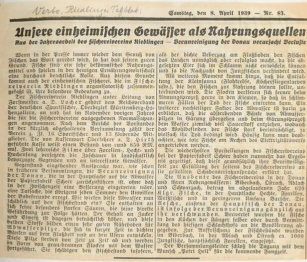 Interessant ist in diesem Zusammenhang eine Zeitungsnotiz über die Mitgliederversammlung am 30. März 1939. In ihr wurde ausführlich über die Donauverunreinigung und ihre Auswirkung berichtet. Es wurde festgestellt, daß Abwässer keine besonders starken Säuren enthalten. Dagegen sei der Gehalt an Zucker und Eiweiß beträchtlich höher. Sie bildeten einen sehr guten Nährboden für Abwasserpilze und entwickelten sich in kurzer Zeit in dichten Bänken auf dem Flußbett und an den Ufern. Von Zeit zu Zeit würden sie absterben und in Form von grau-braunen Flocken mit dem Wasser fortgeführt. Der dichte Überzug am Flußboden mache den Fischen das Laichen unmöglich oder erfolglos. Die Entfaltung der Kleinfauna (Flohkrebs, Köcherfliegenlarve u.s.w.) werde unterbunden.